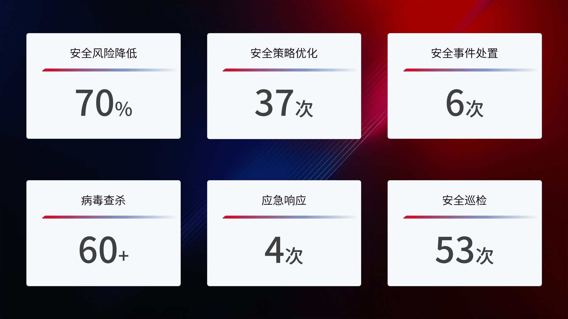 提供全面的安全事件报告体系,,,包括处置报告、、、周报、、、、季度和年度总结,,,结合持续监控,,,,帮助客户深入了解网络安全状况。。